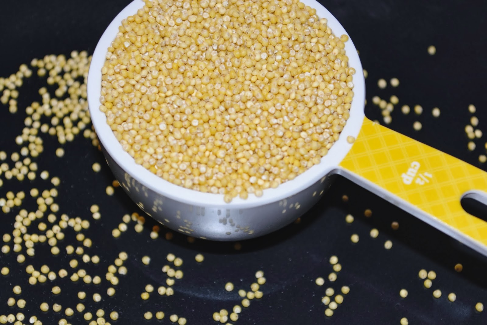 Bardzo lubię proso. Małe kuleczki pełne zdrowia. Naturalnie bezglutenowe zboże, trochę zapomniane. Czytałam, że jest niechętnie przygotowywane w kuchni ze względu na dziwny zapach. Dla mnie pachnie bardzo przyjemnie. Przed gotowaniem prażę proso na suchej patelni, przesypuję do garnka, zalewam wrzącą wodą i gotuję przez chwilkę. Krócej niż sugerują producenci na opakowaniach.