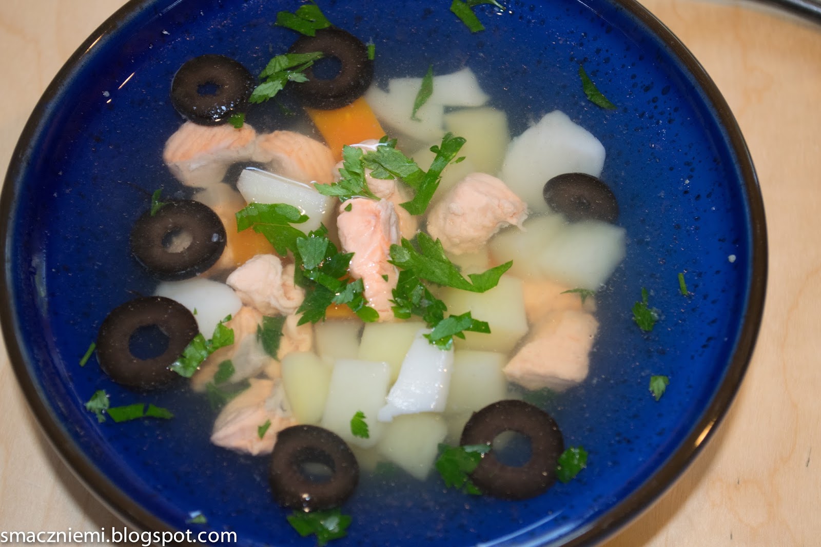 Dzisiaj nabrałam ochoty na zupę z małżami, a że nie dostałam ich w żadnym sklepie, to w zamian kupiłam przegrzebki i łososia. Moją zupę ciężko nazwać rybną, ale smakuje doskonale. Jest lekka i delikatna.